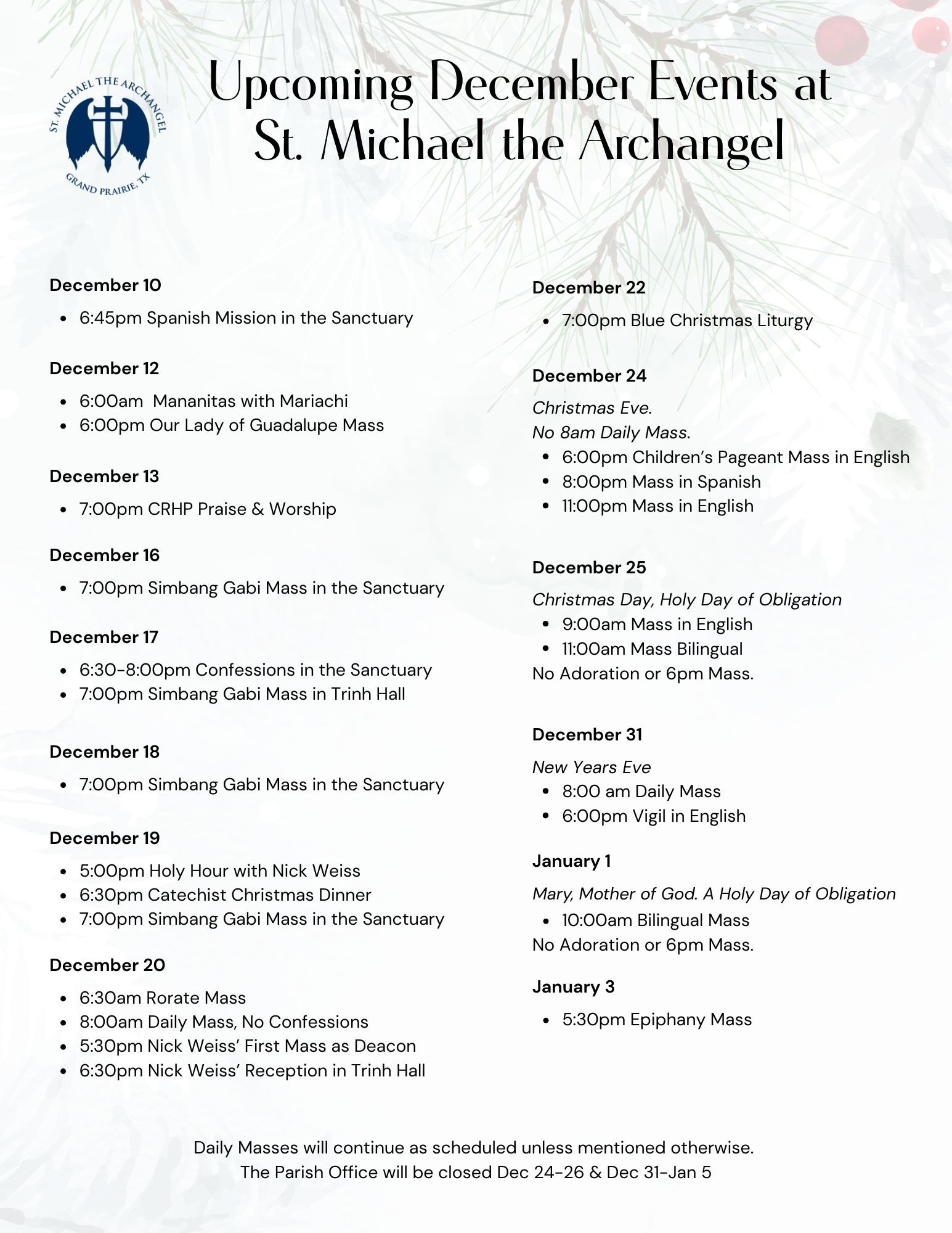St. Michael the Archangel Catholic Parish Grand Prairie, Texas Gospel Readings: https://bible.usccb.org/bible/readings/12.07.25cfm GospelĀ Meditations Dec. 7, 2025 Second Sunday of Advent Matthew 3:1-